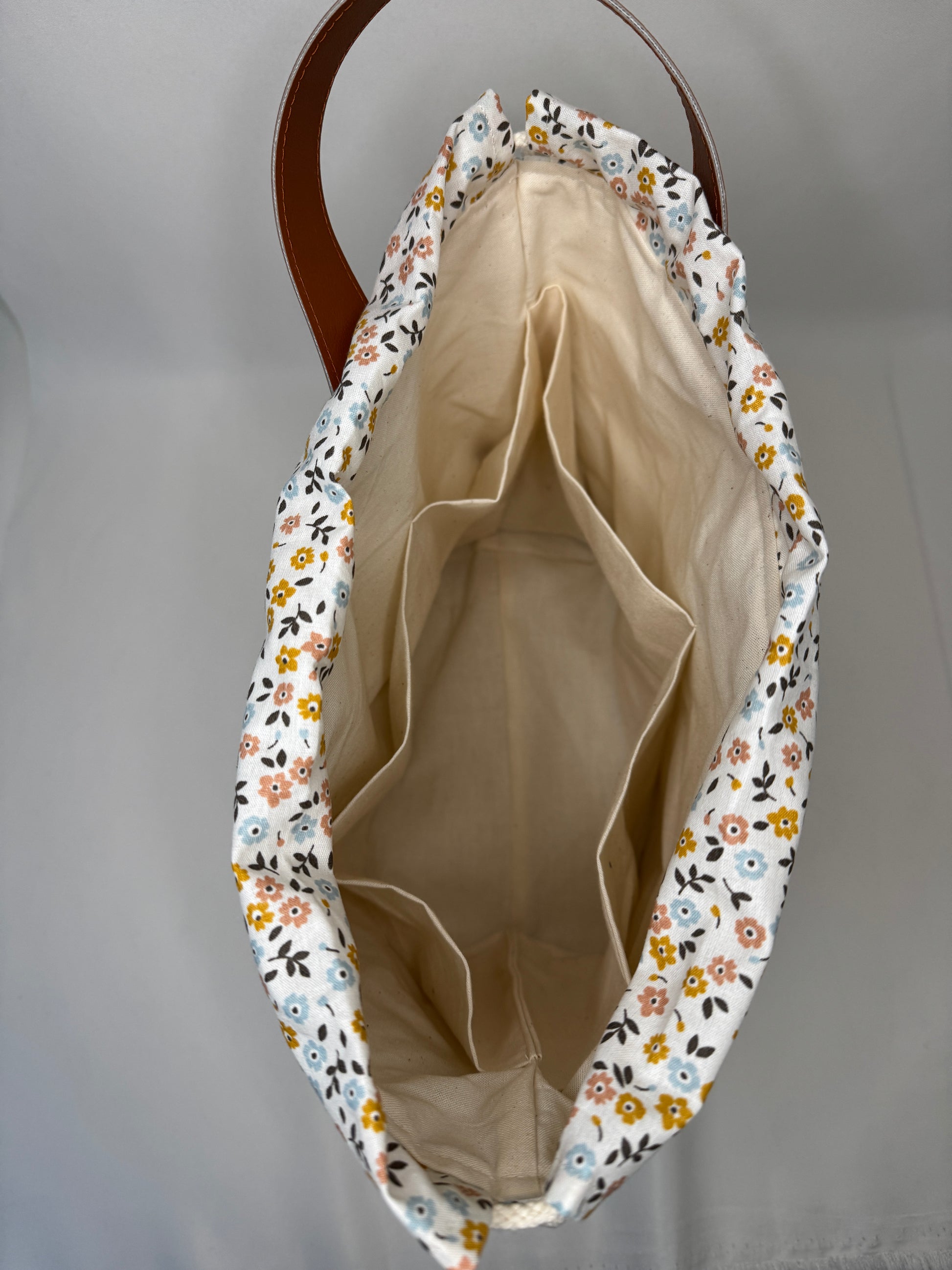 De buitenstof heeft een vrolijke print en is verstevigd, waardoor de tas goed in vorm blijft. Binnenin vind je één ruim hoofdvak en vijf handige kleinere vakjes, perfect om je brei- of haakprojecten, garen en accessoires overzichtelijk in op te bergen. Dankzij het stevige skai leren handvat neem je de tas gemakkelijk overal mee naartoe.