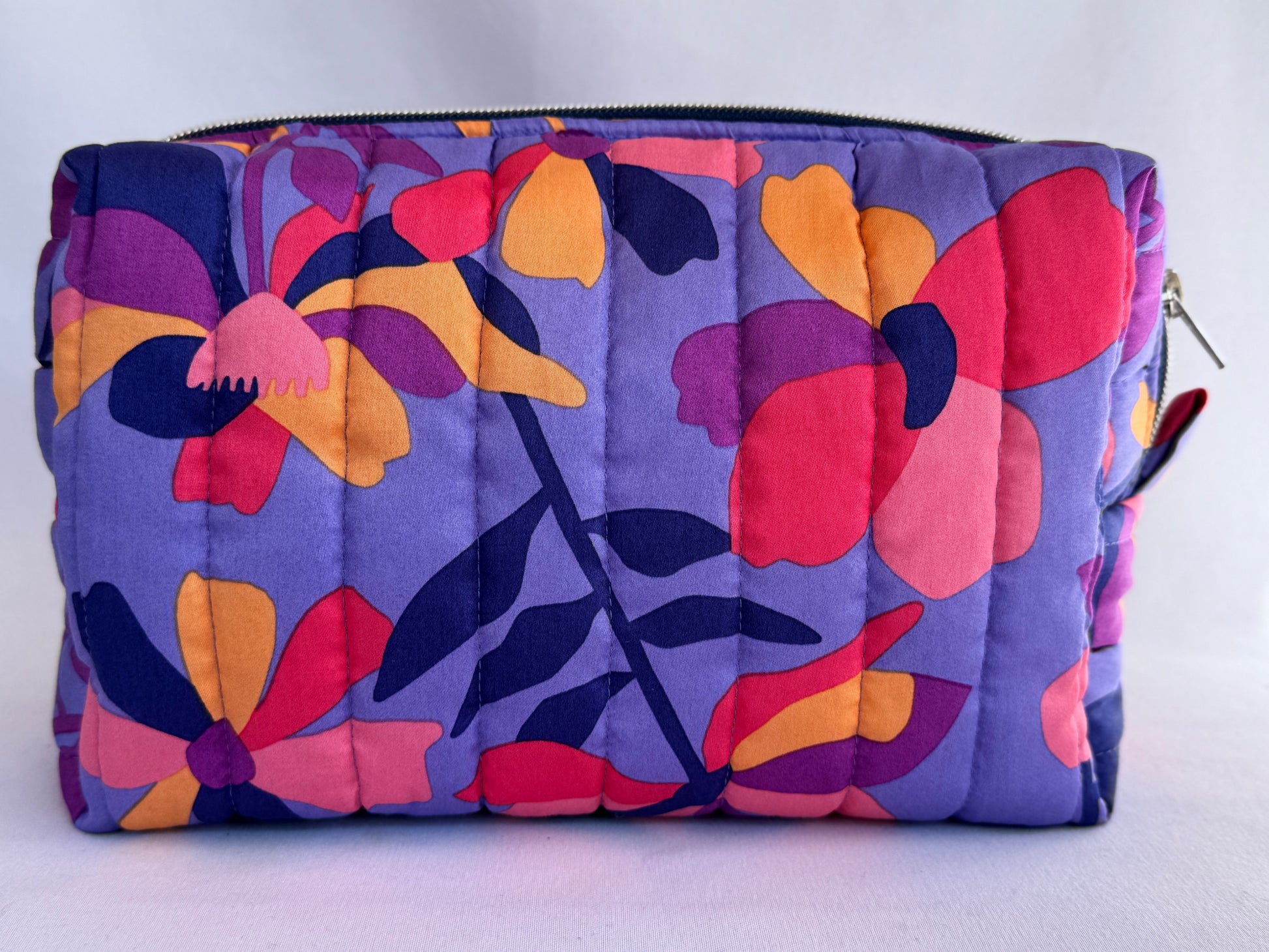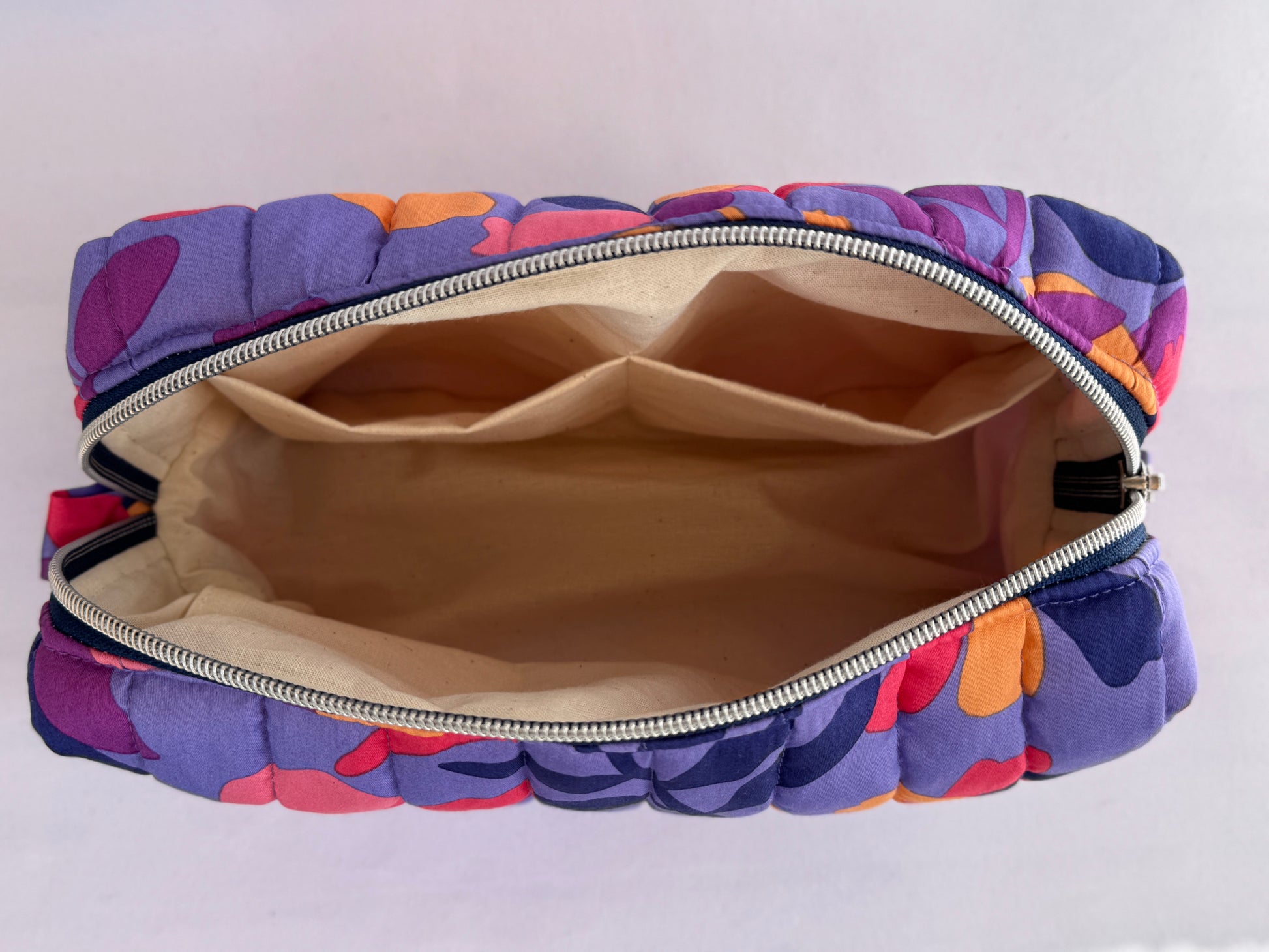 Verwen jezelf met deze prachtige en unieke toilettas! De buitenstof heeft een vrolijke print en is gequilt met 1,5 cm dik fiberfill waardoor hij stevig is en zijn vorm goed behoudt. Binnenin vind je twee handige vakjes om al jouw verzorgingsproducten overzichtelijk in op te bergen. Dankzij het ruime formaat neem je moeiteloos al je reisbenodigdheden mee. Perfect als kleurrijke toilettas voor onderweg of thuisgebruik.